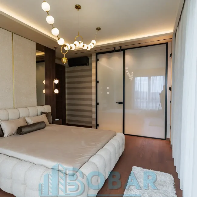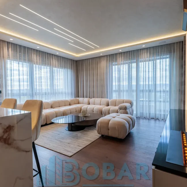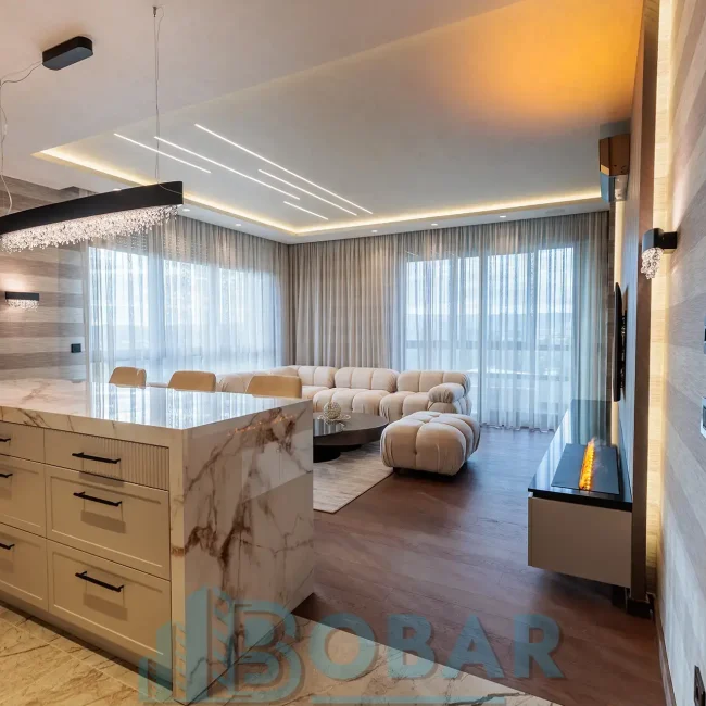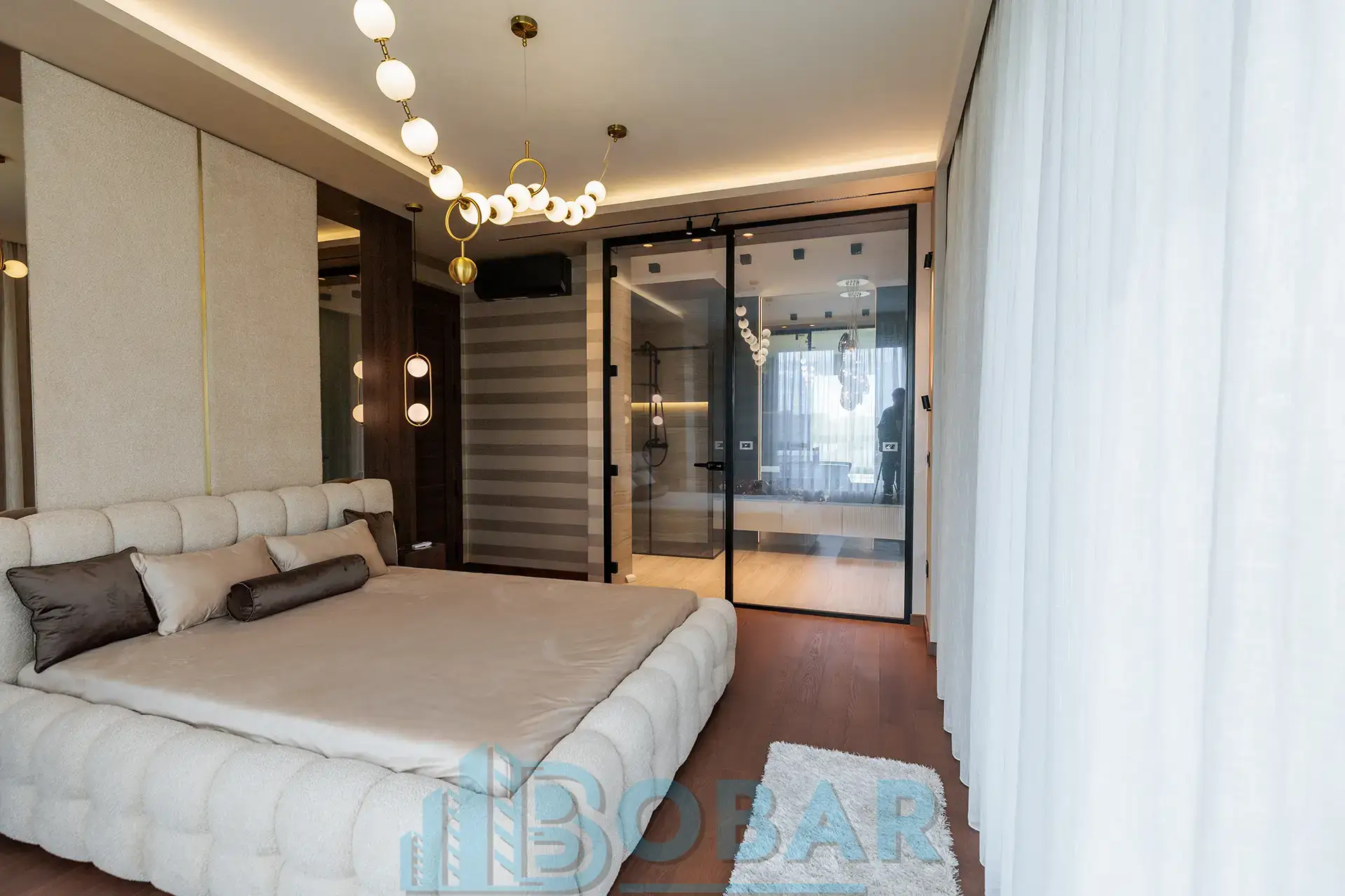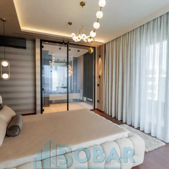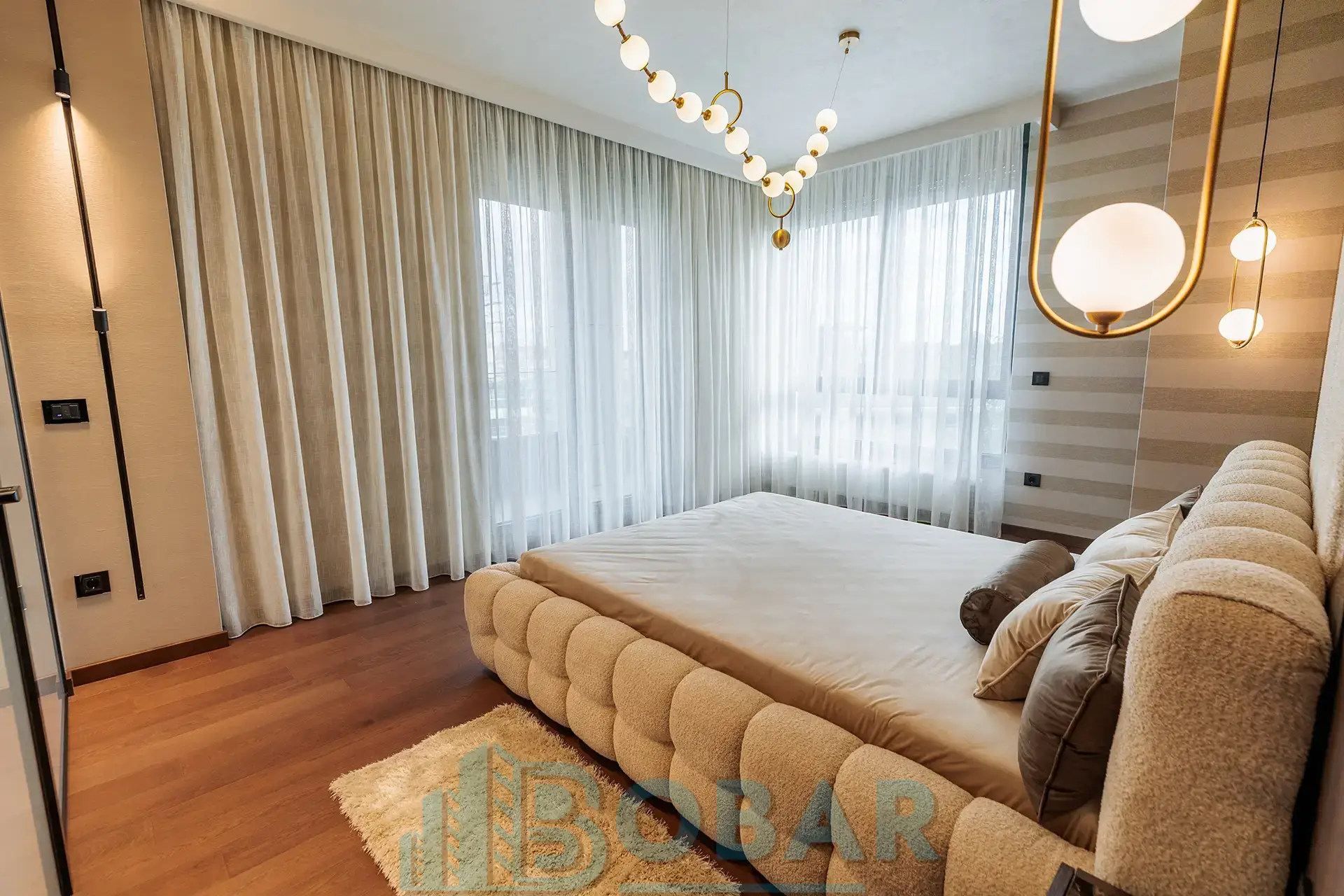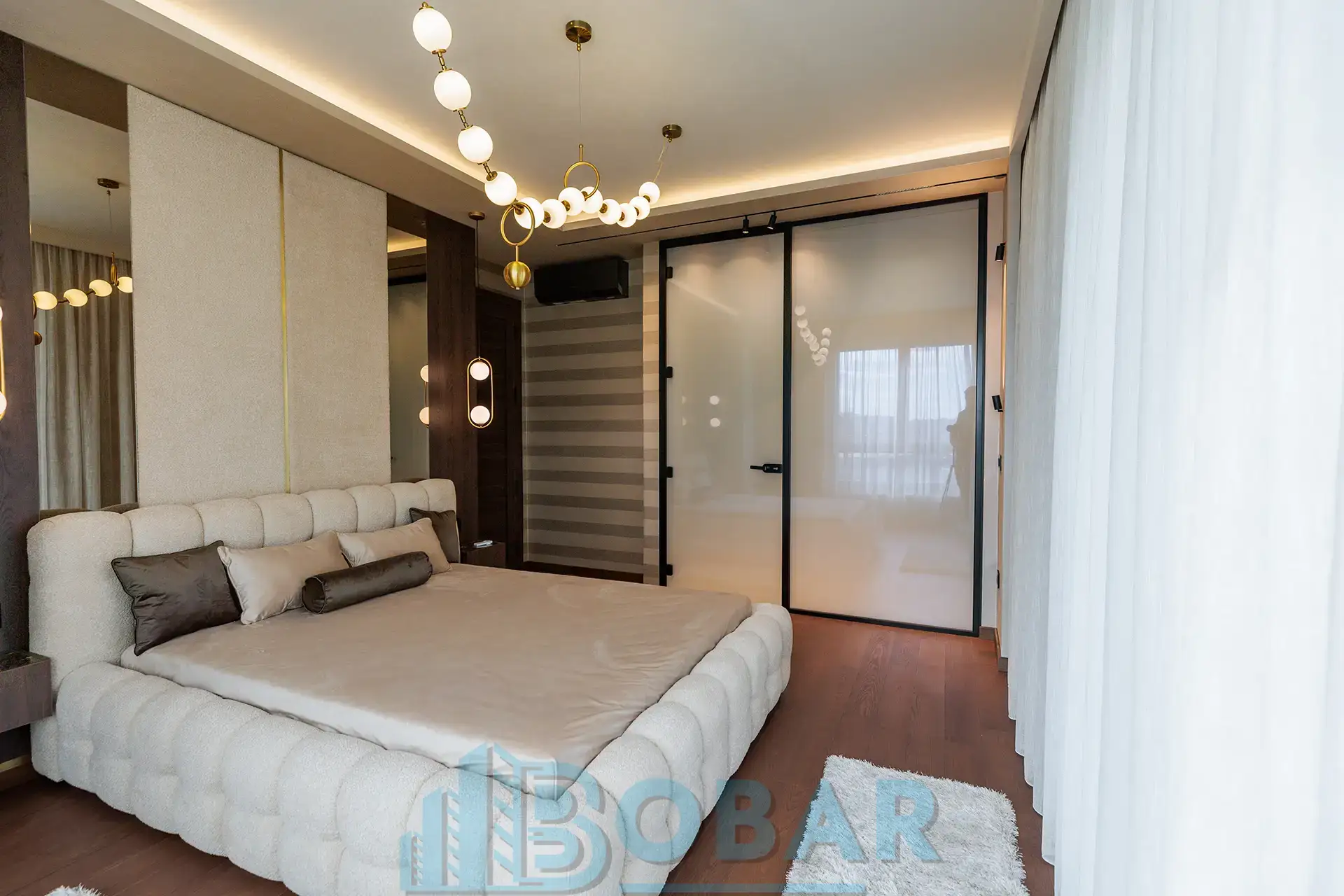 Ovaj luksuzno opremljen stan od 100 m² pruža savršenu kombinaciju prostranog dnevnog boravka, moderne kuhinje i elegantne spavaće sobe koja vodi u zaseban garderober. Stan poseduje dva funkcionalna kupatila, a pažljivo projektovan raspored, vrhunski materijali i premium nameštaj stvaraju sofisticiran i udoban ambijent, gde svaki detalj doprinosi luksuzu i maksimalnoj funkcionalnosti.