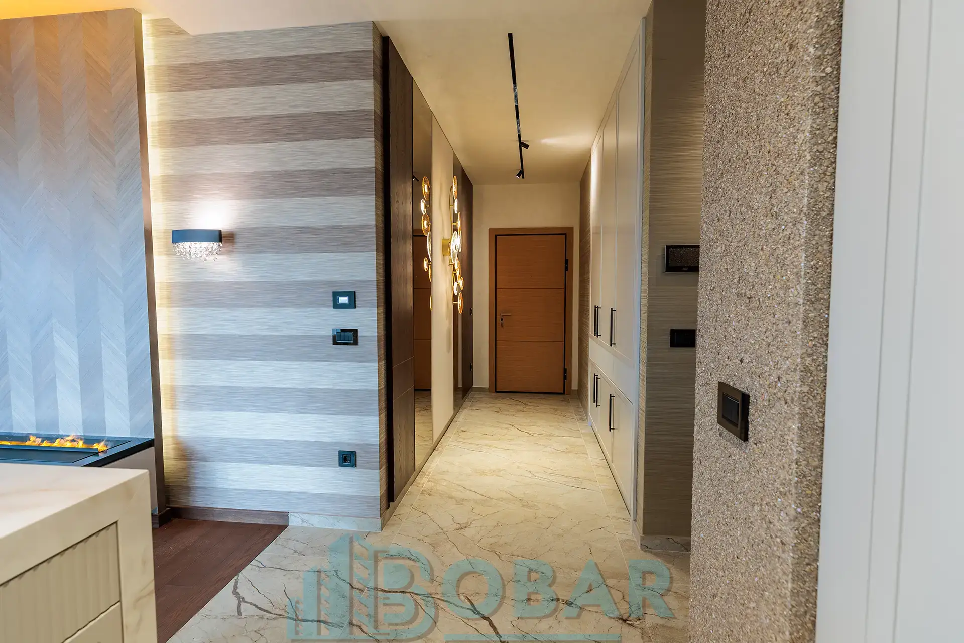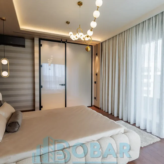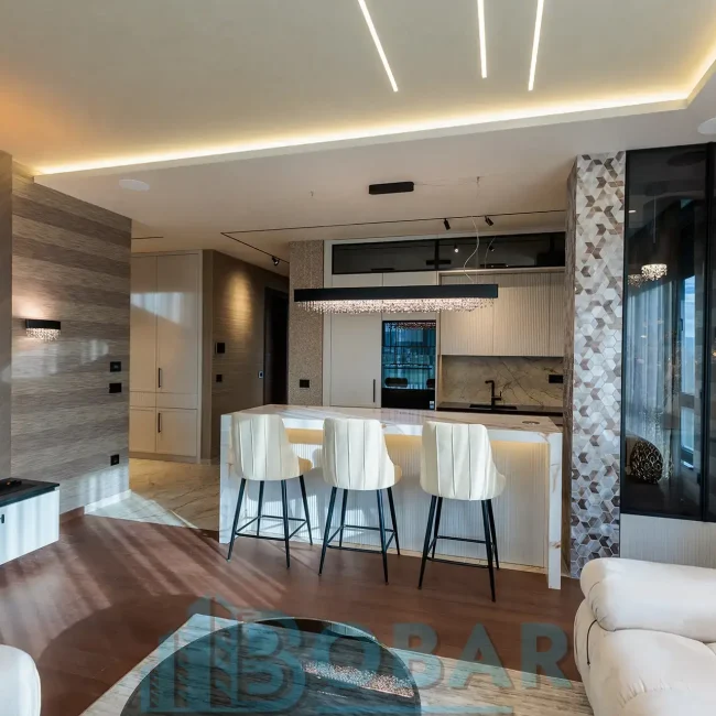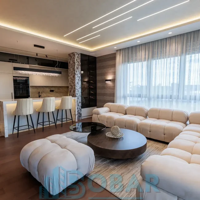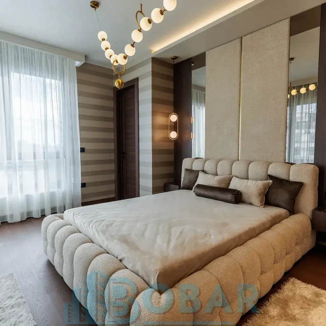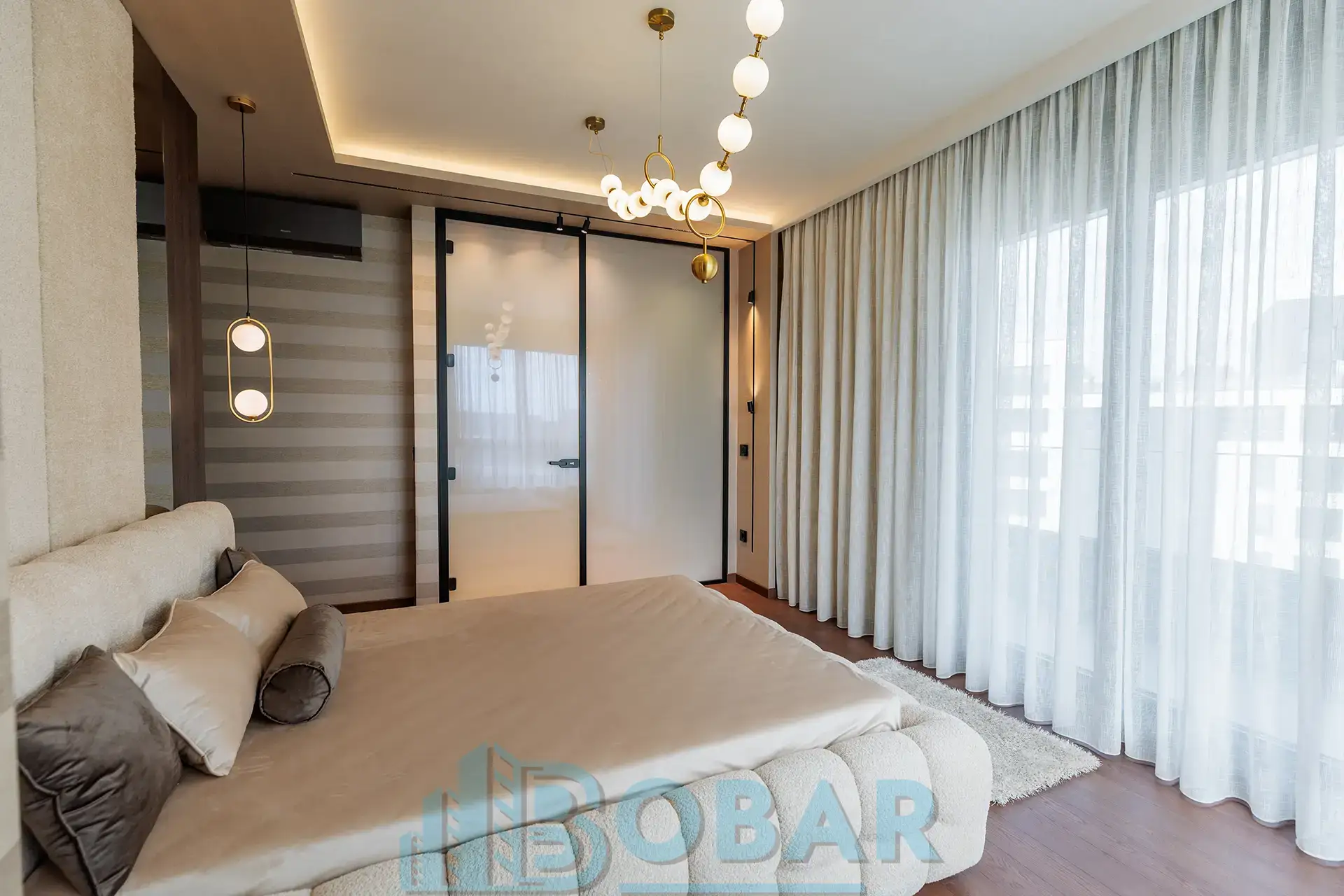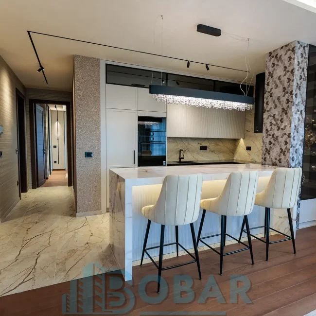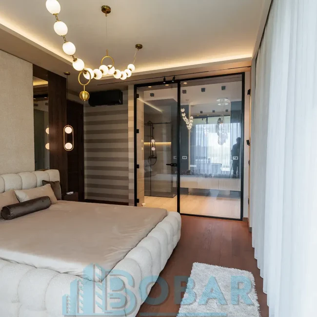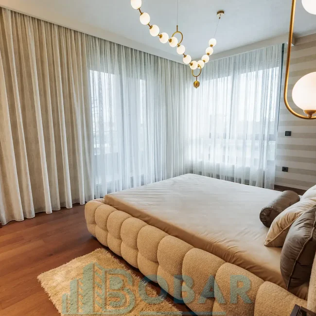 Ovaj luksuzno opremljen stan od 100 m² pruža savršenu kombinaciju prostranog dnevnog boravka, moderne kuhinje i elegantne spavaće sobe koja vodi u zaseban garderober. Stan poseduje dva funkcionalna kupatila, a pažljivo projektovan raspored, vrhunski materijali i premium nameštaj stvaraju sofisticiran i udoban ambijent, gde svaki detalj doprinosi luksuzu i maksimalnoj funkcionalnosti.